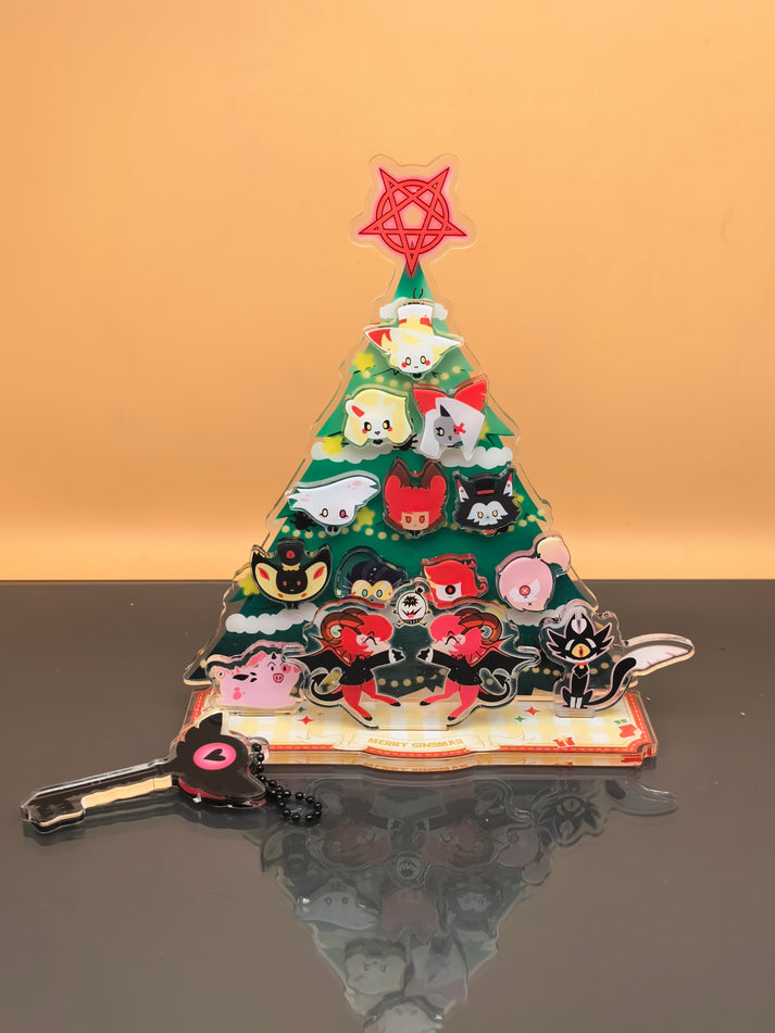 It consists of 10 magnetic pieces and 4 insertable acrylic components. Yes, our theme is "Sinsmas"! The whole standee set is made from a single large acrylic sheet. The 10 magnetic pieces can be placed freely according to your preferences. They represent the 10 staff members of the Hazbin Hotel, including Sir Pentious, who has already ascended to heaven. They've gathered together to celebrate the holiday! Of course, we haven't forgotten the adorable animal staff members either! Besides these, there's also a cute keychain with a chain—Meowy!