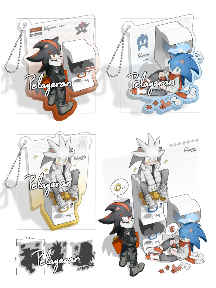 Hi everyone! This is one of my upcoming designs—a clear, colorful acrylic charm inspired by three hedgehogs and a capsule toy (gachapon) theme.